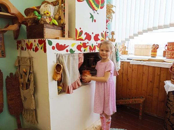 - Дети знакомятся с интерьером крестьянской избы, домашней утварью и её назначением. Приходя сюда, ребята как будто погружаются в те времена, когда были в избах печи, и люди, готовили в них еду; когда вместо металлических ложек были деревянные; когда не было кастрюль, а использовали чугунки; когда не было швейных машинок, а в избе стояла прялка.